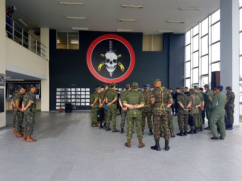 Militares do comando da intervenção federal no RJ faz uma inspeção no Batalhão de Operações Policiais Especiais (Bope), em Laranjeiras, na Zona Sul do Rio, nesta quarta-feira (21). A ação é comandada pelo general Mauro Sinott, chefe de gabinete da interveção.