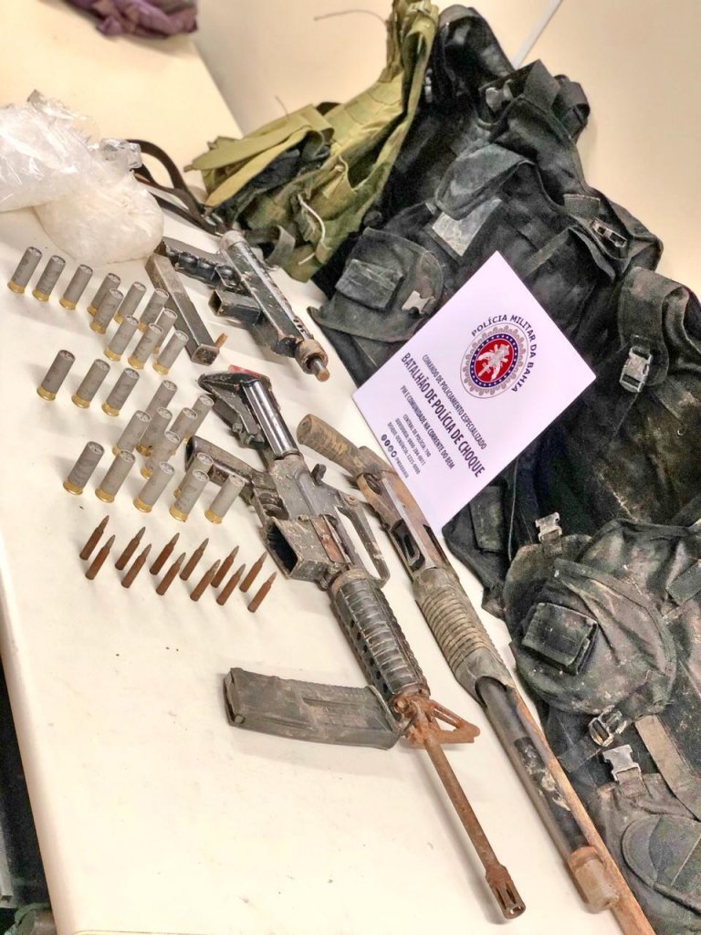 Fuzil, submetralhadora, espingarda, munições e coletes balísticos foram localizados pelo Batalhão de Choque (BPChq) da PM, no final da tarde de segunda-feira (6), em uma espécie de bunker. O flagrante ocorreu, no bairro de Sussuarana, em Salvador.