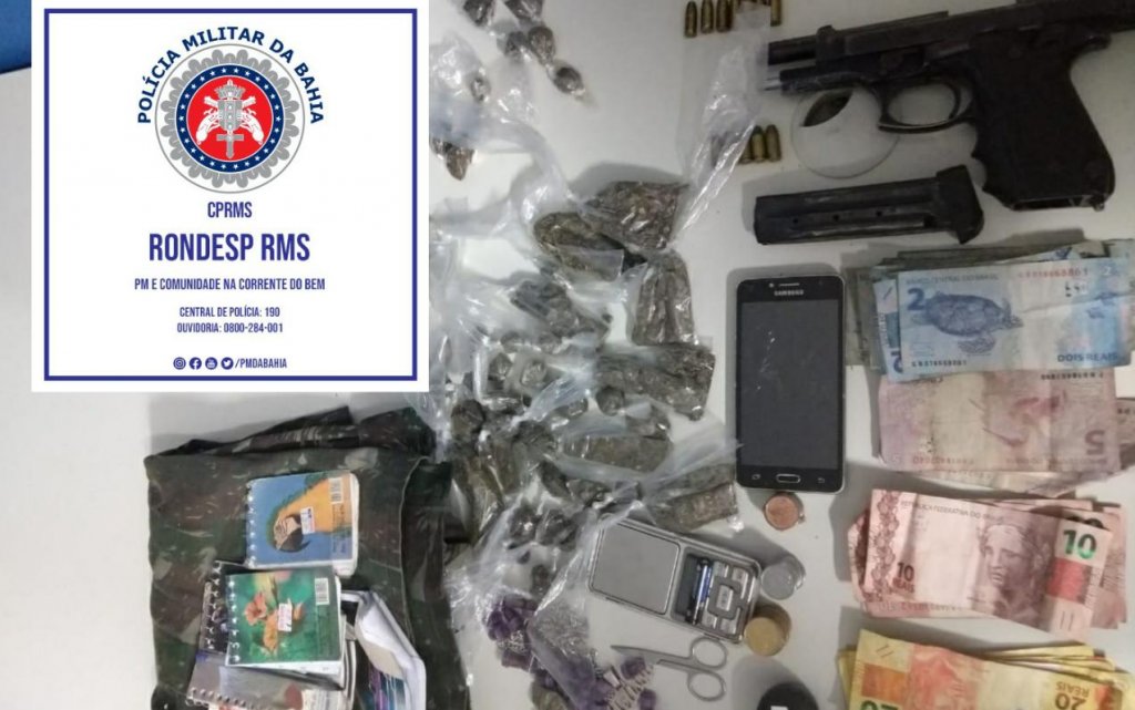 Com o trio foram apreendidos uma pistola calibre 7,65, um revólver calibre 32, carregadores, munições, 199 porções de maconha, 30 pinos de cocaína, R$ 926, três balanças, seis cadernos com anotações sobre o comércio de drogas, celular, roupa camuflada, duas tesouras e embalagens plásticas.