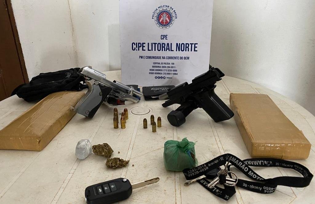 Guarnições da Companhia Independente de Policiamento Especializado (Cipe) Litoral Norte interceptaram, na tarde de terça-feira (25), traficantes com carro blindado, na BA-099. Pistolas, carregadores, munições e dois quilos de maconha foram apreendidos.