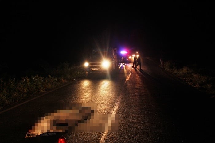 O condutor da moto caiu dentro do mato na lateral da pista e depois a mulher no meio da rodovia numa distancia de mais de 20 metros de um para o outro e o carro com a moto presa a frente dos dois corpos.