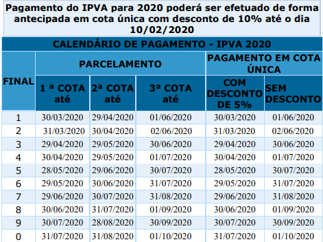 Os débitos referentes à taxa de licenciamento e às multas de trânsito deverão ser pagos até a data de vencimento da terceira parcela. Os débitos anteriores do IPVA ainda não notificados também podem ser divididos em três vezes, juntamente com o IPVA 2020. No entanto, o proprietário que perder o prazo da primeira cota deixa de ter o direito ao parcelamento em três vezes. O pagamento do tributo referente a embarcações e aeronaves deverá ser efetuado até 1º de junho de 2020.