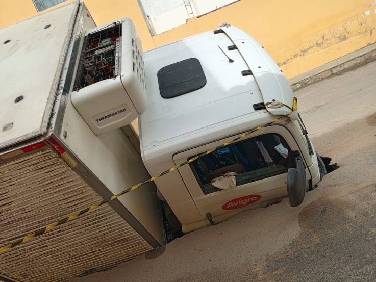 Segundo informações, o veículo transitava pela via, quando o asfalto cedeu e parte do caminhão ficou preso na cratera. De acordo com testemunhas, o local onde a pavimentação afundou passa um canal.