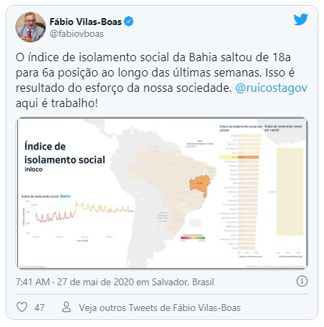 O secretário estadual da Saúde, Fábio Vilas-Boas, disse na manhã desta quarta-feira (27), em uma publicação no Twitter, que o índice de isolamento social na Bahia saltou da 18ª posição para a 6ª. Segundo o secretário, "isso é resultado do esforço da nossa sociedade".