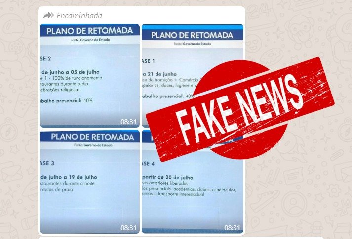 Imagens que explicam o plano de retomada da economia do estado do Ceará foram retiradas do contexto e estão sendo divulgadas massivamente por meio do aplicativo WhatsApp na Bahia, com o objetivo de confundir as pessoas. As imagens que estão sendo disseminadas fazem parte de uma reportagem de 28 de maio da TV Verdes Mares, afiliada da TV Globo no Ceará. A matéria pode ser assistida neste link: https://globoplay.globo.com/v/8587587/.