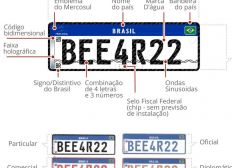 A placa terá quatro letras e três números, emblema do Mercosul, bandeira do Brasil, marca d'água e código de barras bidimensional (QR-Code).