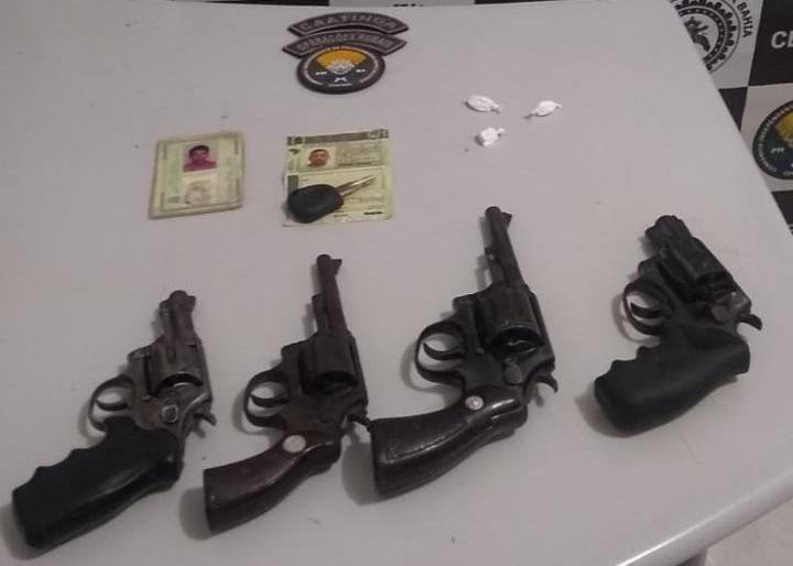 Com o quarteto foram apreendidos quatro revólveres calibres 38 e 32, munições, porções de cocaína e o veículo modelo Logan, placa OZJ-8792.