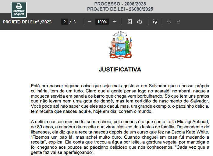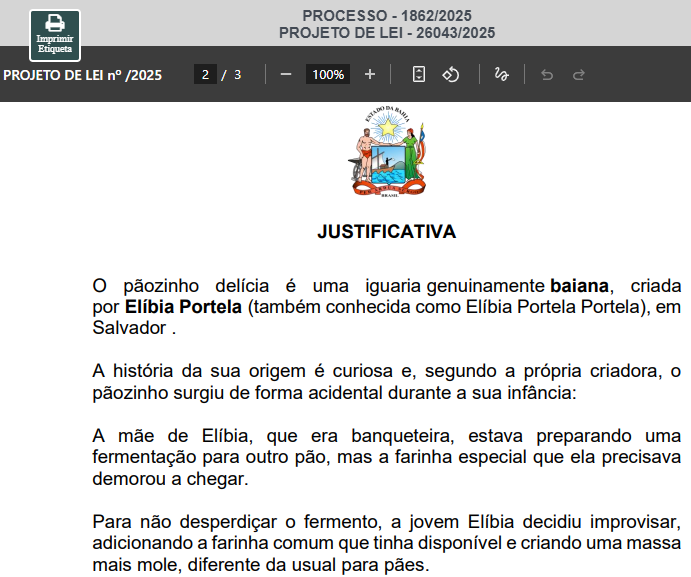 A nova versão do projeto foi apresentada no dia 9 de dezembro (PL 26.080/2025) e já menciona Laila Abboud como responsável pela criação do famoso pão delícia. Confira: