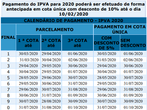 Os débitos referentes à taxa de licenciamento e às multas de trânsito deverão ser pagos até a data de vencimento da terceira parcela. Os débitos anteriores do IPVA ainda não notificados também podem ser divididos em três vezes, juntamente com o IPVA 2020. No entanto, o proprietário que perder o prazo da primeira cota deixa de ter o direito ao parcelamento em três vezes. O pagamento do tributo referente a embarcações e aeronaves deverá ser efetuado até 1º de junho de 2020.