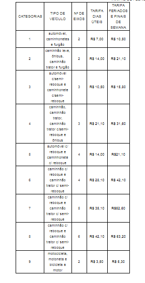 Na praça de pedágio da BA-099, operada pela CLN, a tarifa aplicada para automóveis, caminhonetes e furgão passa a ser de R$ 7,00 em dias úteis e de R$ 10,50 aos finais de semana e feriados.Outras categorias de veículos, a exemplo de caminhões, ônibus e motocicletas também passarão por readequação tarifária. A mudança de valores foi readequada com base no Índice Nacional de Preços ao Consumidor Amplo (IPCA) para cada categoria de veículo, conforme tabela a seguir.