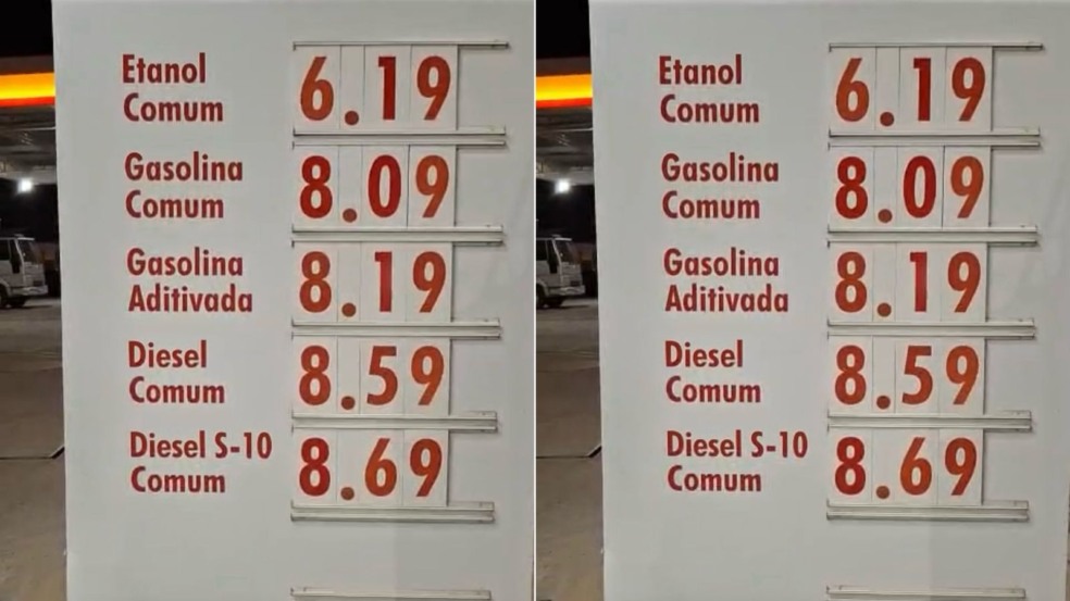 Além da gasolina aditivada a R$ 8,19, o painel de preços exibido no vídeo mostra outros valores elevados: gasolina comum a R$ 8,09, etanol comum a R$ 6,19, diesel comum a R$ 8,59 e diesel S-10 a R$ 8,69.