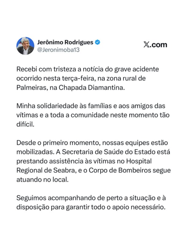 A prefeitura de Palmeiras emitiu uma nota lamentando o ocorrido e se solidarizou com amigos e familiares das vítimas. O governador do estado, Jerônimo Rodrigues também se emitiu uma nota de pesar nas redes sociais.