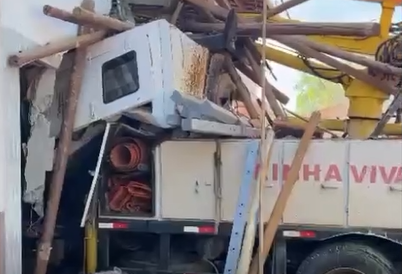 Câmeras de segurança registraram o momento exato em que o caminhão passou rápido, assustando quem estava no local. Vídeos feitos por testemunhas, mostram o estrago após o acidente. Parte do veículo ficou preso na parede do imóvel.