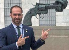 “As operações de paz da ONU acertadamente usam armas. Mas na entrada do prédio da ONU em NY fica essa escultura desarmamentista. Como todo bom desarmamentista, eis a máxima ‘armas para mim, desarmamento para os outros’”, escreveu Eduardo em uma rede social.