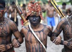 Índios da etnia munduruku ocupam, desde a madrugada de domingo (16), o canteiro de obras da Usina Hidrelétrica São Manoel, obra do Programa de Aceleração do Crescimento (PAC) em construção no Rio Teles Pires, na divisa dos estados do Mato Grosso e do Pará, a cerca de 125 quilômetros de Paranaíta (MT).