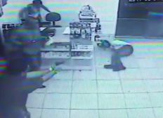 O crime aconteceu por volta das 21h em uma farmácia na Avenida Afonso Pena, no Setor Rodoviário. As imagens mostram o assaltante entrar no local usando um capacete. Enquanto vários clientes aguardam na fila, ele aponta arma para uma mulher que está no caixa e, segundos depois, o revólver dele cai no chão e ele é baleado.