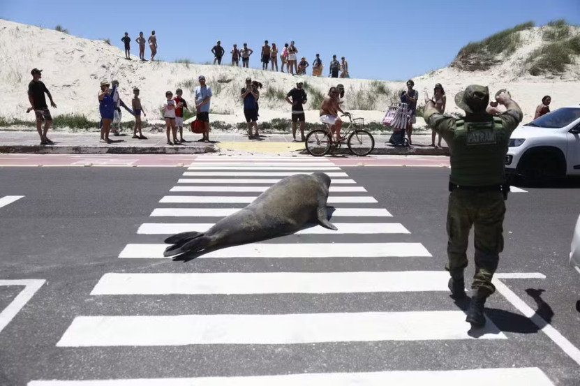 Em um vídeo que circula nas redes sociais é possível ver o animal atravessando uma faixa de pedestre da Avenida Beira Mar. Ele segue sobe nas dunas em direção à praia. Banhistas fizeram um corredor até que o elefante marinho conseguiu chegar ao mar em segurança.