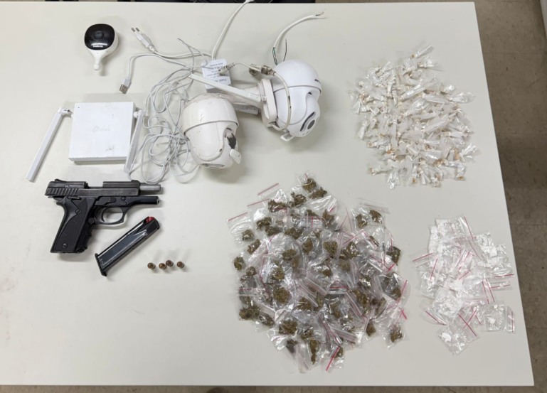 Com ele, os agentes apreenderam uma pistola Taurus calibre .380, 119 papelotes de crack, 103 porções de skank e 25 embalagens de cocaína. Além disso, os policiais encontraram três câmeras de monitoramento clandestino e um modem.