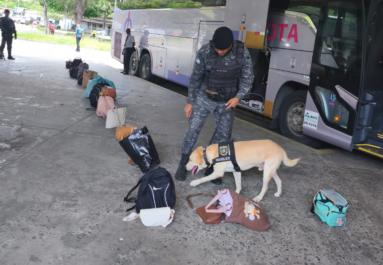Durante a operação, foram realizadas abordagens preventivas, patrulhamento no interior e no entorno do terminal, além do emprego de cão farejador, com foco na localização e apreensão de armas e drogas.