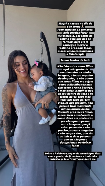 No story, Bia Miranda revelou ainda que, por ser prematura, a filha enfrenta malformação na coluna e está em processo de fisioterapia.