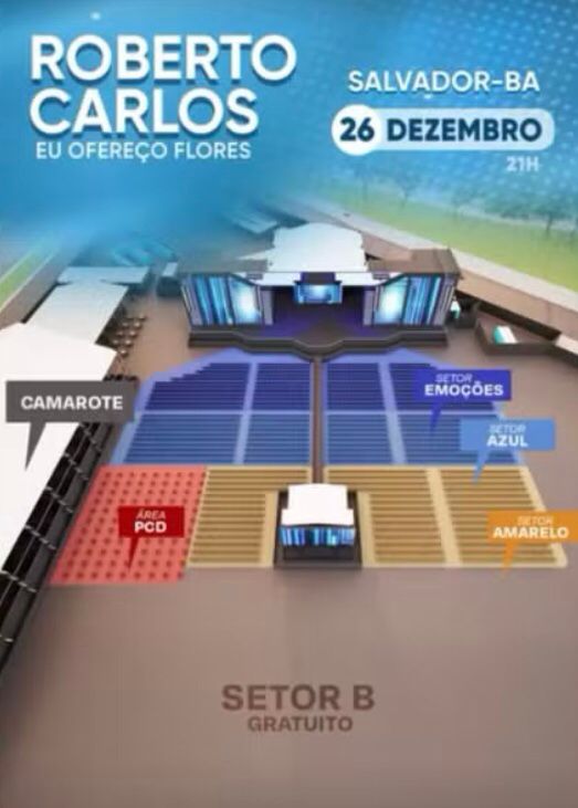 O Rei Roberto Carlos vai desembarcar em Salvador para realização de um show gratuito marcado para o dia 26 de dezembro, na Arena O Canto da Cidade, no bairro da Boca do Rio. A produção do evento divulgou o mapa e os setores da festa, através das redes sociais.