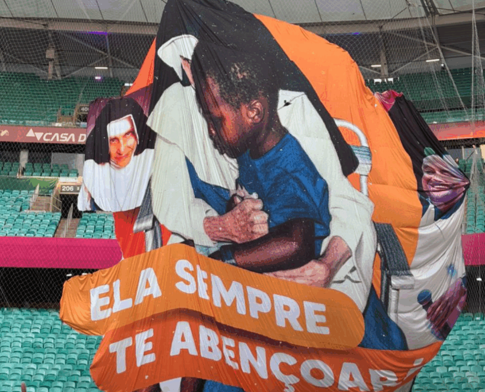 O cantor Thiaguinho se emocionou durante a turnê Tardezinha ao ser homenageado com uma “bandeira” de uma imagem dele com Santa Dulce. O evento aconteceu no sábado (25), na Arena Fonte Nova, em Salvador.