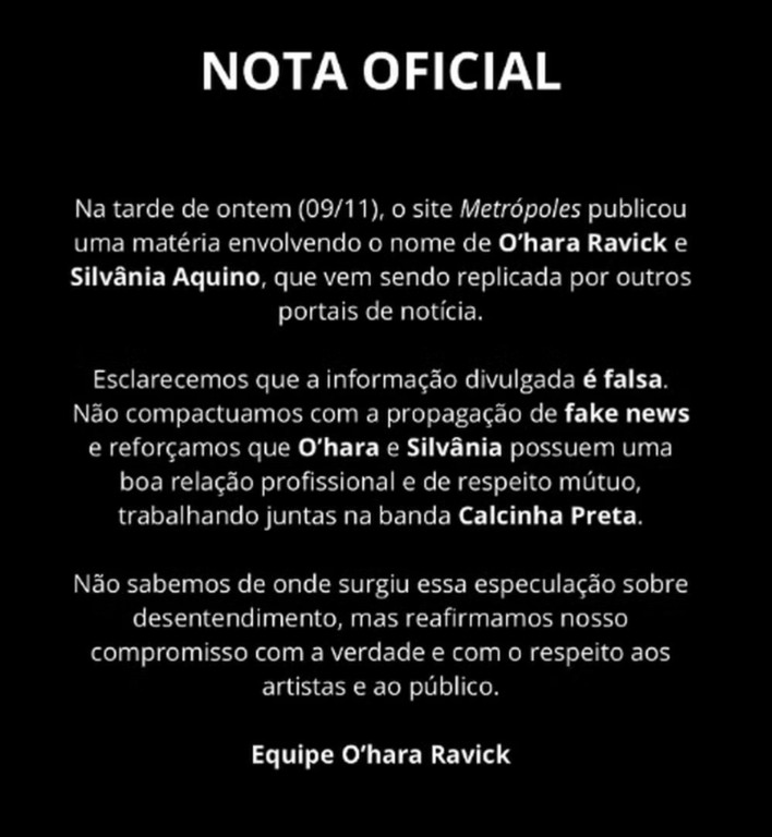 Não compactuamos com a propagação de fake news e reforçamos que O’hara e Silvania possuem uma boa relação profissional e de respeito mútuo, trabalhando juntas na banda Calcinha Preta”, diz o texto.