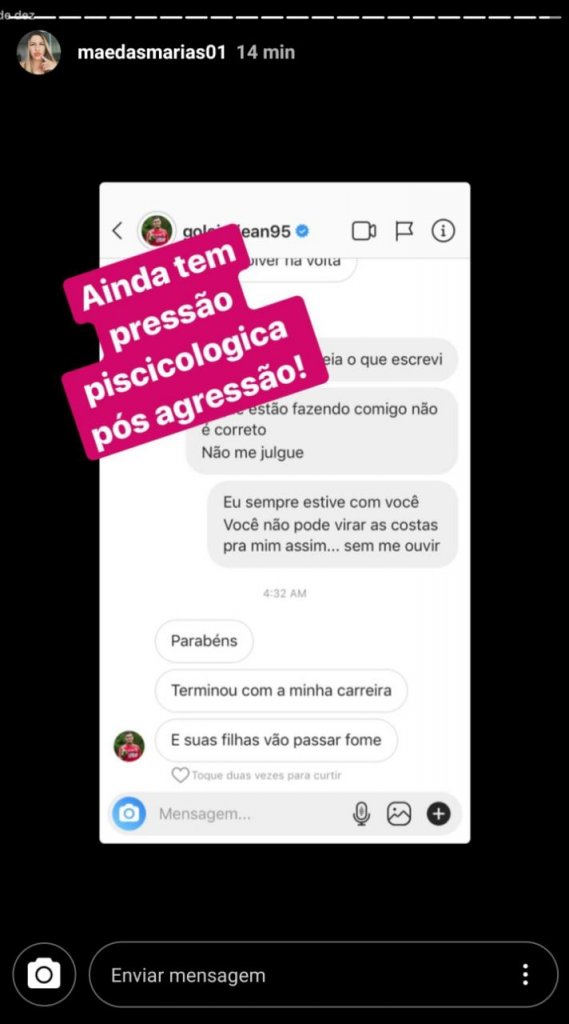 Ela também divulgou uma conversa que teve no aplicativo com o jogador. Segundo o diálogo, ela relata a pressão psicológica que teria vivido. "Parabéns. Terminou com minha carreira. E suas filhas vão passar fome", escreve o jogador, que atualmente defende o São Paulo.