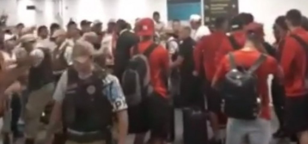 A torcida Imbatíveis fez um protesto nesta segunda-feira (30) na chegada dos jogadores do Vitória no Aeroporto Internacional de Salvador.