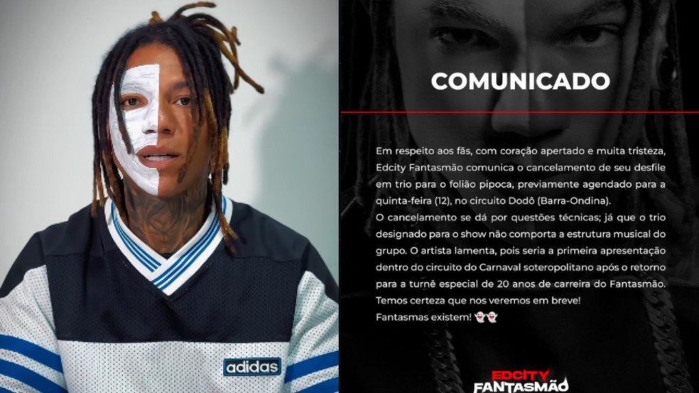 O cantor Edcity anunciou o cancelamento da apresentação da banda Fantasmão no Circuito Dodô, Barra-Ondina, que estava prevista para a próxima quinta-feira (12). O comunicado foi divulgado nas redes sociais do artista.