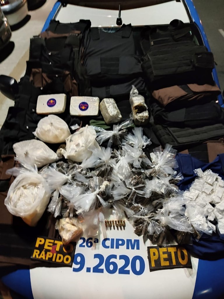 Dentro da estrutura, os PMs apreenderam 26 coletes balísticos pertencentes a uma empresa de segurança, quatro mil pinos de cocaína, 2,5 kg e 376 papelotes de maconha, 2 kg de pasta base de cocaína e munições (calibres 9mm e 40).