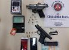 A dupla passava pela barreira policial, em um carro modelo Sandero, quando foi abordada. Dentro do automóvel, após buscas, os militares localizaram as pistolas calibres 45 e 380, carregadores, munições, dois celulares, um videogame e 167 reais.