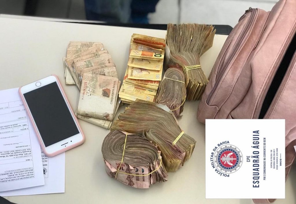 Na BR-324, o veículo foi encontrado e abordado. Em uma bolsa, com a mulher, uma guarnição do Águia encontrou 15 mil reais em espécie. Questionada a origem, a suspeita disse não saber de quem era o valor transportado por ela. Comentou apenas que receberia mil reais para entregar o montante a uma pessoa em Feira de Santana.