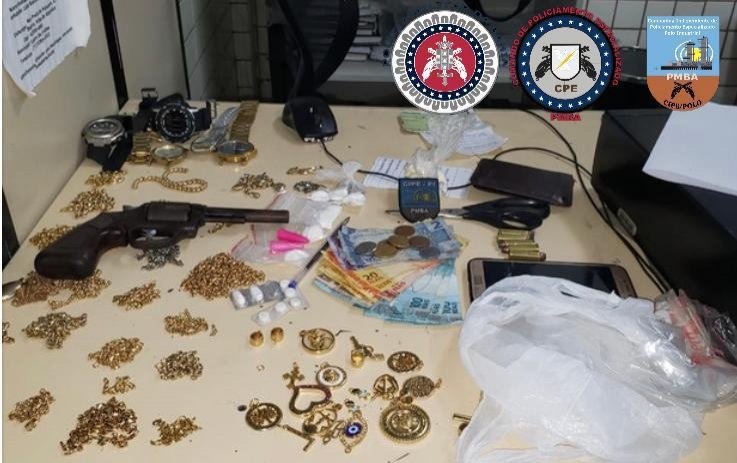 Foram encontrados com o criminoso um revólver calibre 38, munições, pingentes, gargantilhas, correntes, relógios, seis porções de cocaína, uma porção de crack, tesoura, embalagens plásticas e R$ 611 em espécie.