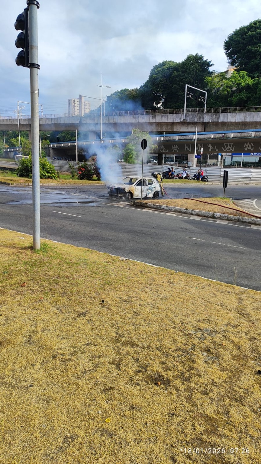 Um veículo pegou fogo na manhã deste domingo (18), na Avenida Bonocô, uma das principais vias de Salvador. O incidente ocorreu na altura do acesso ao Ogunjá e foi registrado em vídeo.