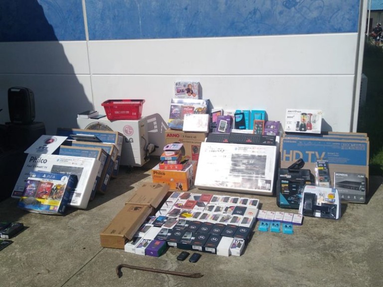 Com eles os PMs apreenderam dois revólveres calibres 32 e 38, dois carros usados para cometer os furtos, 14 TVS, 80 aparelhos celulares, 21 tabletes, um notebook, dois PS4, um karaokê, dois teclados, um ventilador, um multiprocessador, dois suportes de TV, liquidificador, oito fones de ouvido, duas furadeiras, um Xbox, 12 pop GTS, um controle de TV, um carregador, uma gaveta cofre e três caixas de som.