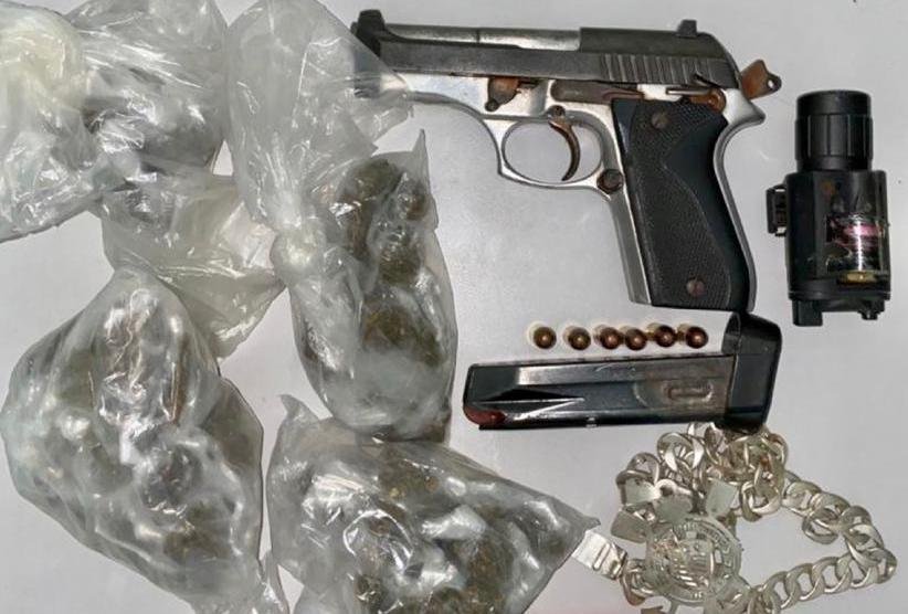 Com ele foram apreendidos uma pistola calibre 380, carregador, munições, uma lanterna tática pra arma longa, 74 porções de maconha, 60 reais e um celular.