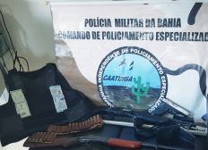 Com ele foram encontrados uma espingarda calibre 32, uma cartucheira contendo quatro cartuchos e 13 estojos de metal, quatro cartuchos de fuzil, um simulacro de espingarda calibre 12, um simulacro de pistola G17 e uma capa de colete balístico.
