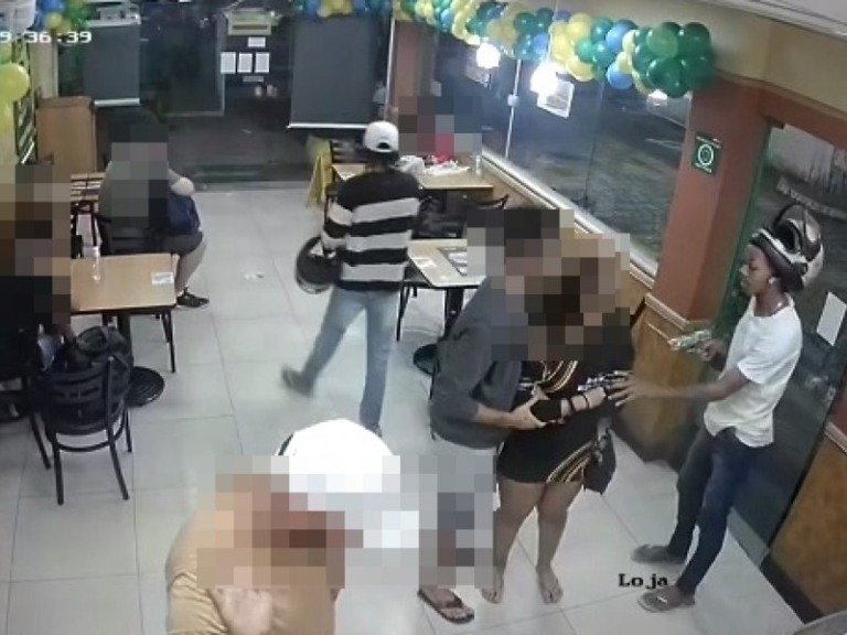 As imagens mostram o momento em que a dupla chegou ao local a pé, mas ambos estavam com capacete. Logo em seguida, os homens – trajando camisas branca e listrada – anunciam o assalto e recolhem celulares e outros pertences de sete clientes que estavam na lanchonete. Pelo menos um dos suspeitos é visto armado nas imagens.