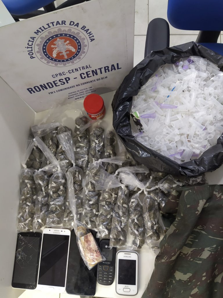 Com eles também foram encontrados diversos pinos para armazenamento de entorpecentes, um caderno com anotações do tráfico, cinco aparelhos celulares, uma tesoura, uma faca e um blusão do Exército. A dupla foi encaminhada à Central de Flagrantes e autuada por tráfico de drogas.