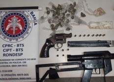 Com a dupla, foram encontrados uma submetralhadora calibre 9mm, um revólver calibre 38, carregador, munições, 21 pinos de cocaína, 44 buchas de maconha e 68 pedras de crack.