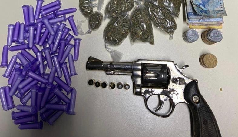 Com o traficante foram apreendidos um revólver calibre 38, munições, 58 pinos de cocaína, 13 porções de maconha, 222 reais e um celular.