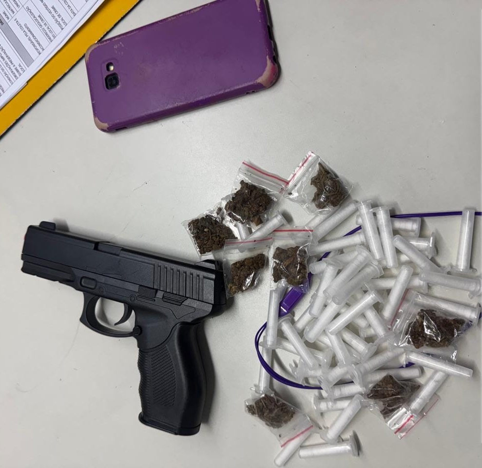 - Apreensão de simulacro de arma de fogo, cocaína, maconha e celular durante a busca pessoal no suspeito.