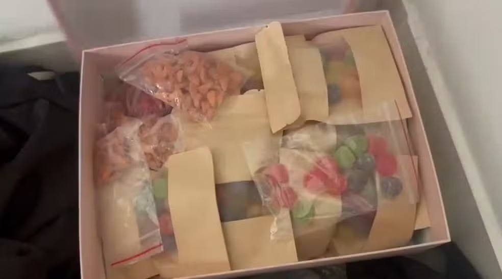 Entre os materiais recolhidos estão aproximadamente 600 comprimidos de ecstasy. Além disso, os agentes encontraram 450 unidades de LSD inseridas em jujubas.