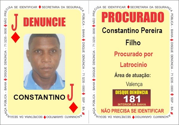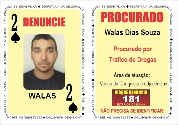 Investigado por tráfico de entorpecentes em Vitória da Conquista e cidades adjacentes, Walas Dias Souza teve o mandado de prisão expedido e passa a ocupar a carta 'Dois de Espadas'.