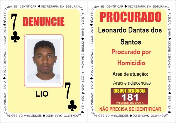O novo representante do 'Sete de Paus' também é procurado por Crime Contra a Vida. Leonardo Dantas dos Santos, conhecido como 'Lio', é acusado de homicídio. Ele atua no município de Araci e em cidades próximas.