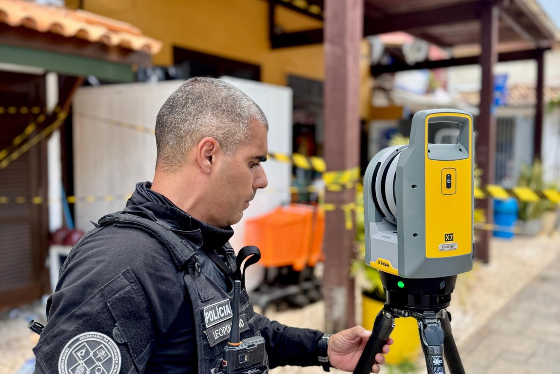 O scanner emite feixes de laser para fazer a varredura do ambiente, mesmo em condições adversas de luminosidade. As imagens produzidas serão anexadas ao laudo e vão auxiliar na determinação da dinâmica do fato.
