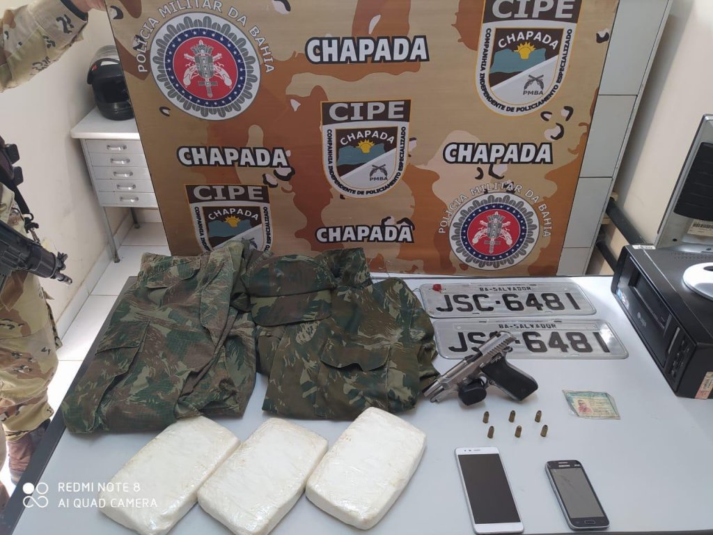 Com ele foram encontrados uma pistola calibre 380, carregador, munições, três quilos de pasta base de cocaína, dois blusões camuflados e duas placas de veículos.