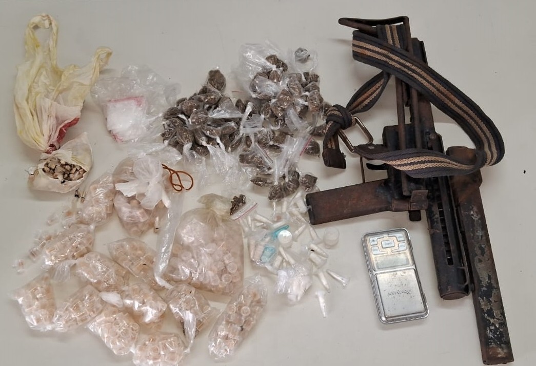 No terreno os PMs localizaram uma mochila contendo uma submetralhadora de fabricação caseira calibre 9mm, um carregador e 17 munições. Também foram apreendidos 150 sacos de maconha, 50 pinos de cocaína e 750 pedras de crack.