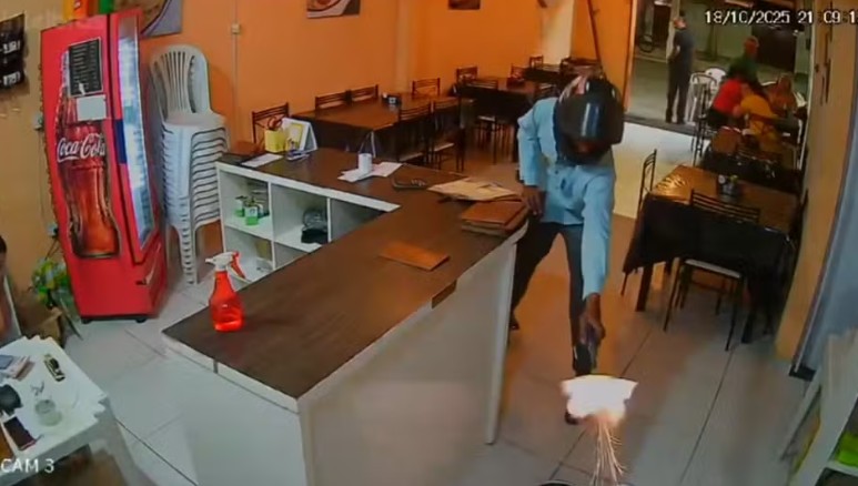 Carlos André da Silva Júnior foi morto dentro de sua própria pizzaria, em um crime registrado por câmeras de segurança. Nas imagens, é possível ver o momento em que um homem de capacete invade o estabelecimento comercial e dispara contra a vítima. O empresário chegou a ser socorrido e levado a um hospital, mas não resistiu.
